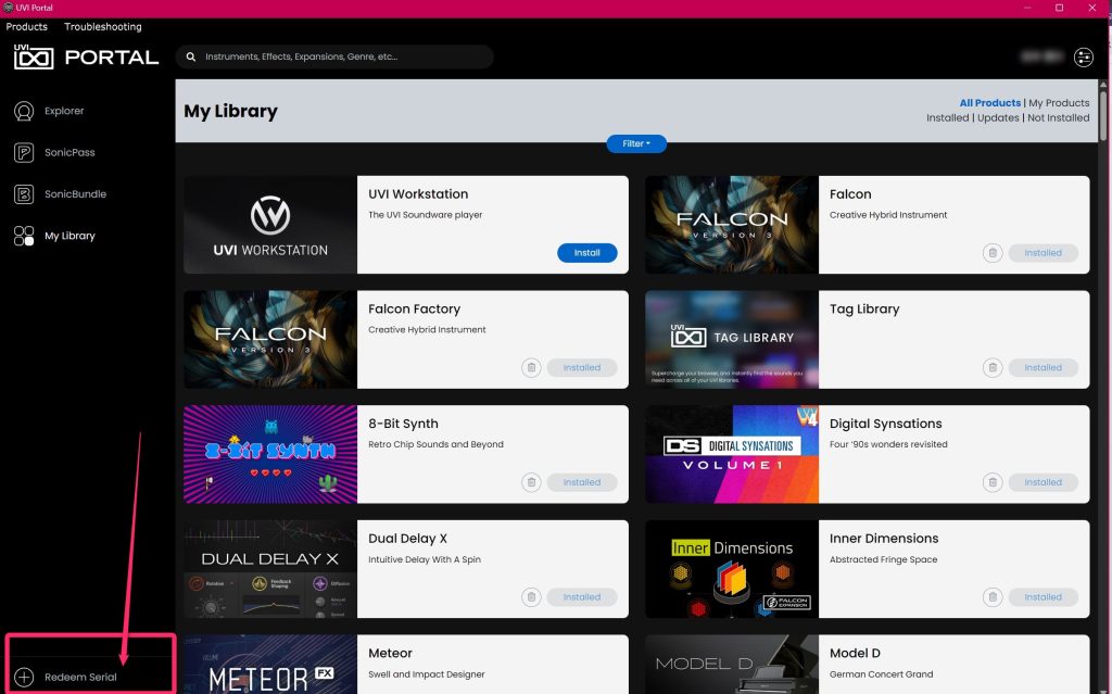 ライセンスを取得したら、UVI PORTALを開き、左下の「Redeem Serial」を押します。