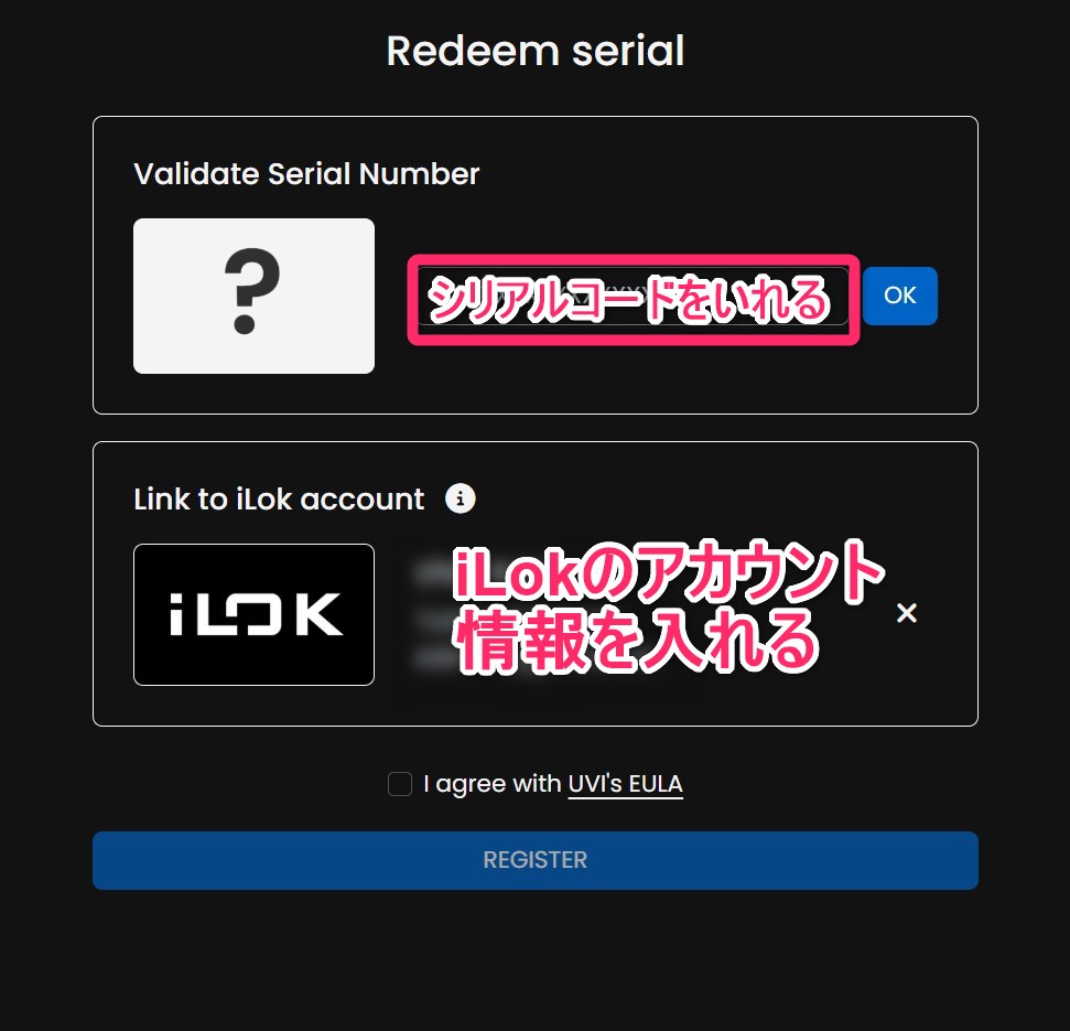 I agree with UVI’s EULAにチェックをいれて「REGISTER」を押します。