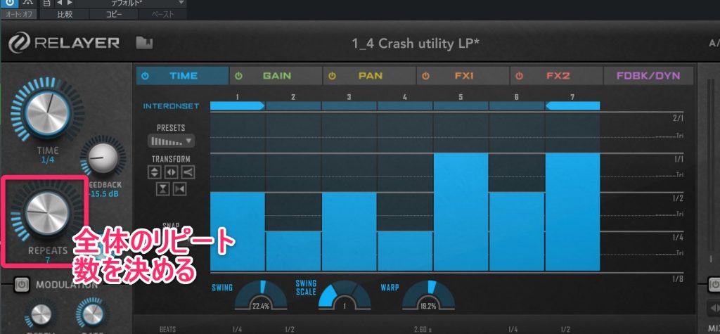 左側にあるREPEATSのノブでディレイを鳴らすステップ数を指定し、ステップごとにディレイの設定を行えます。
