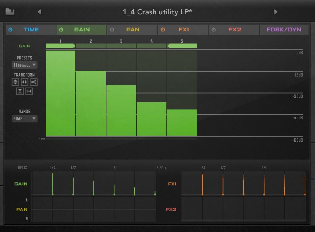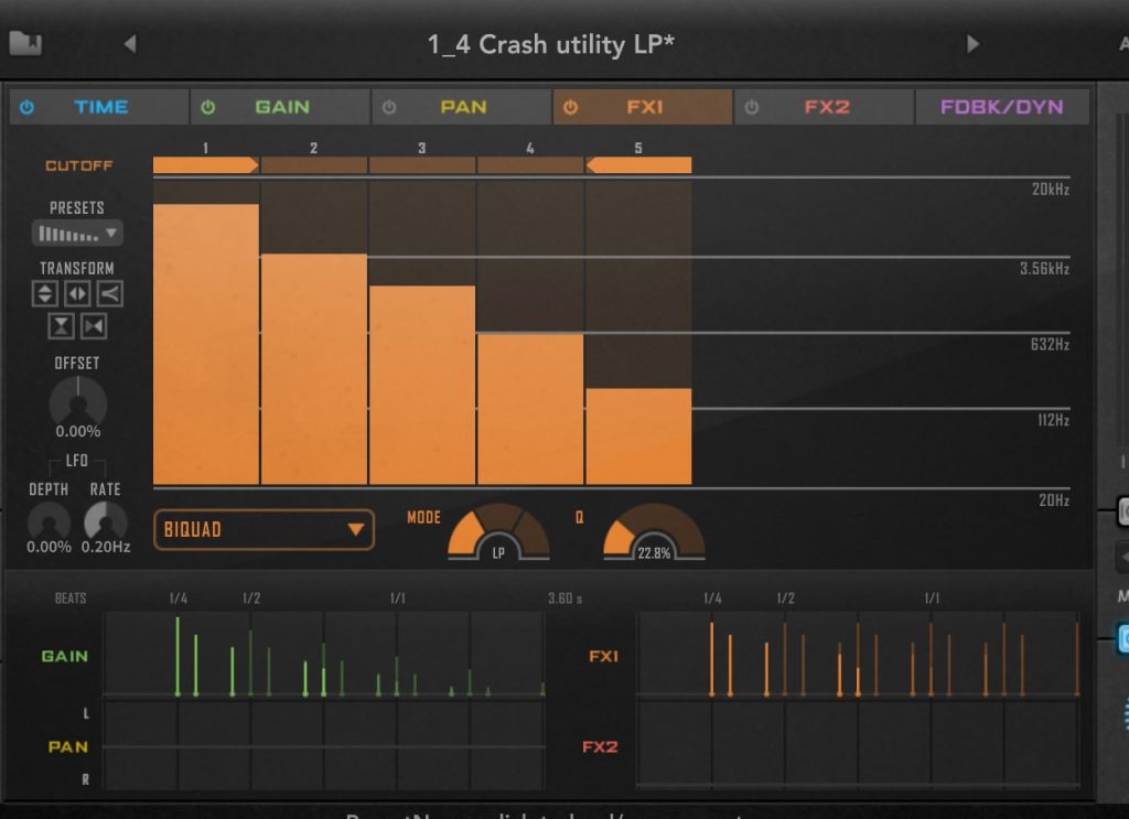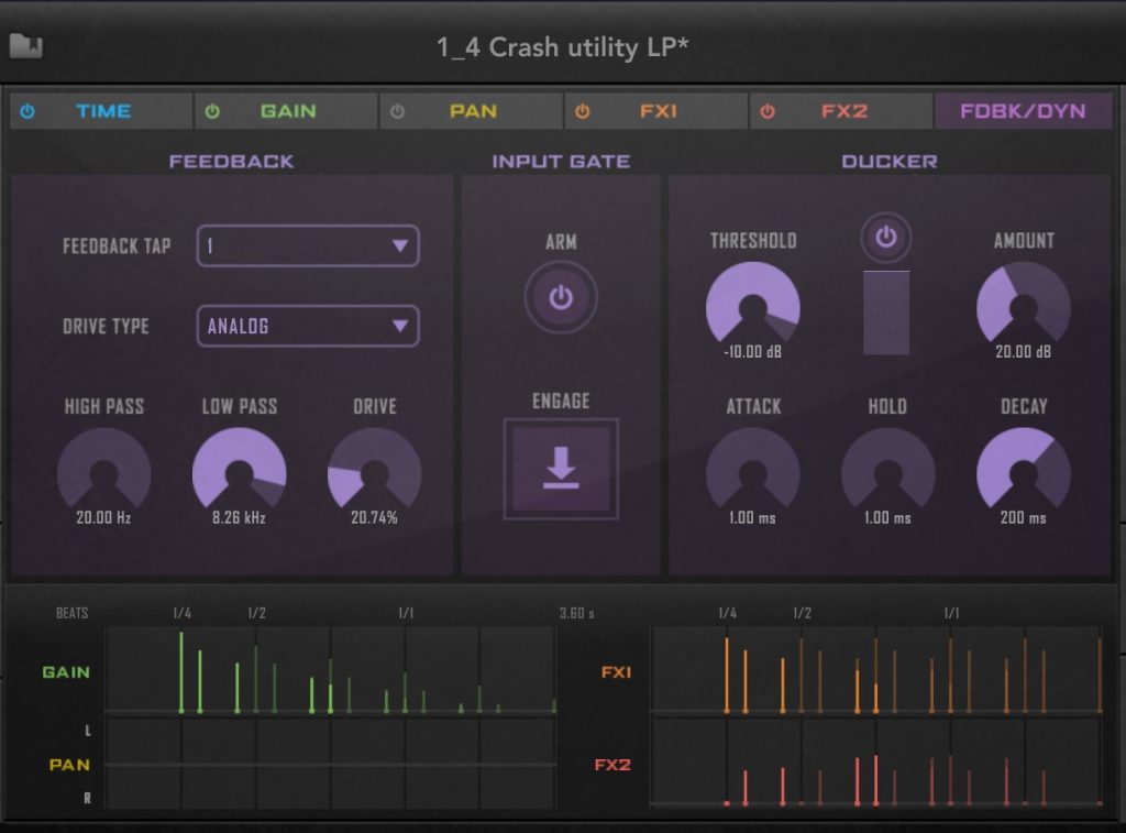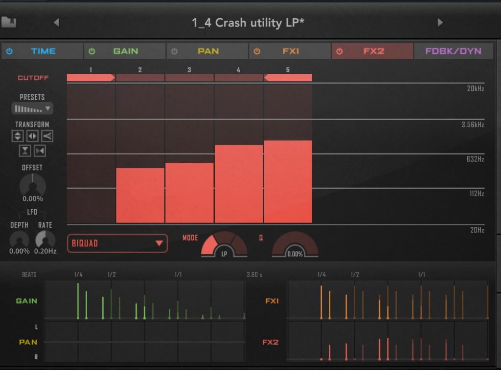 TIME,GAIN,Pan,Fx1,2,FDBK/DYKとタブが分かれていてそれぞれステップごとに効果を調整できます。