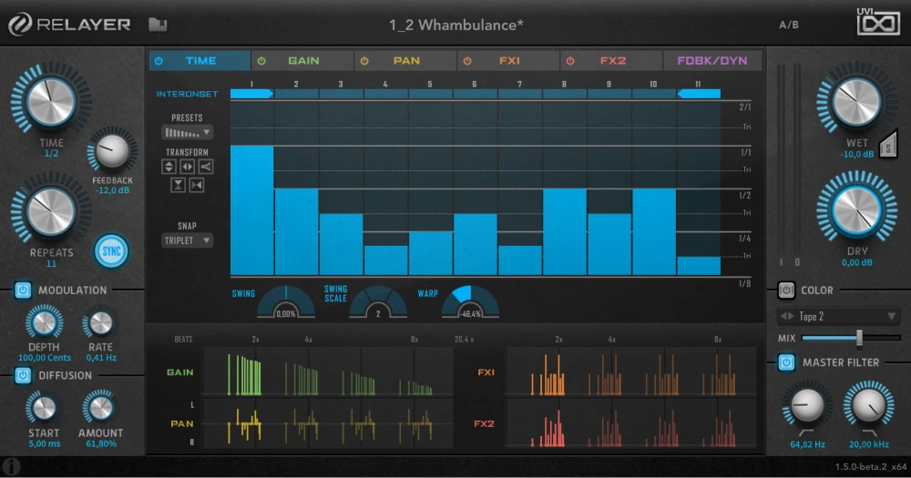 Relayerの中核を成すのは、最大32本のディレイラインを提供する可変マルチタップエンジンです。ディレイタイムは、まず一般的なフリータイムまたはホストシンクのタイムパラメータで設定され、その後スウィングとワープのコントロールでモジュレーションされます。これにより、バウンシングボールのようなエフェクトを素早く簡単に実現できます