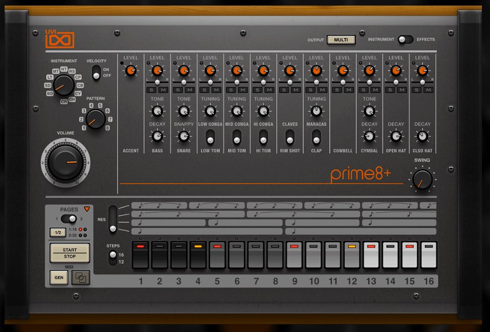 言わずと知れたリズムマシーンの王様、Roland TR-808。UVIは以前から「Prime 8」という音源を出していましたが、それを完全にリニューアルしたのが「Prime 8+」です。 単なるサンプリングではありません。実機の内部トリム(内部にある微調整用のネジ)をいじった状態や、コンソールでサチュレーションさせた音など、808の持つあらゆる表情を収録しています。