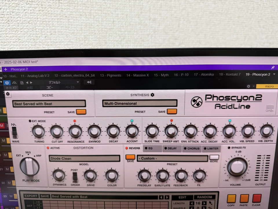 「Phoscyon 2」のコントロールノブはMIDIラーンができるので、手持ちのMIDI鍵盤にコントロールノブがついているならMIDIマッピングをして音を鳴らしていくと実機を使っているような操作感で
