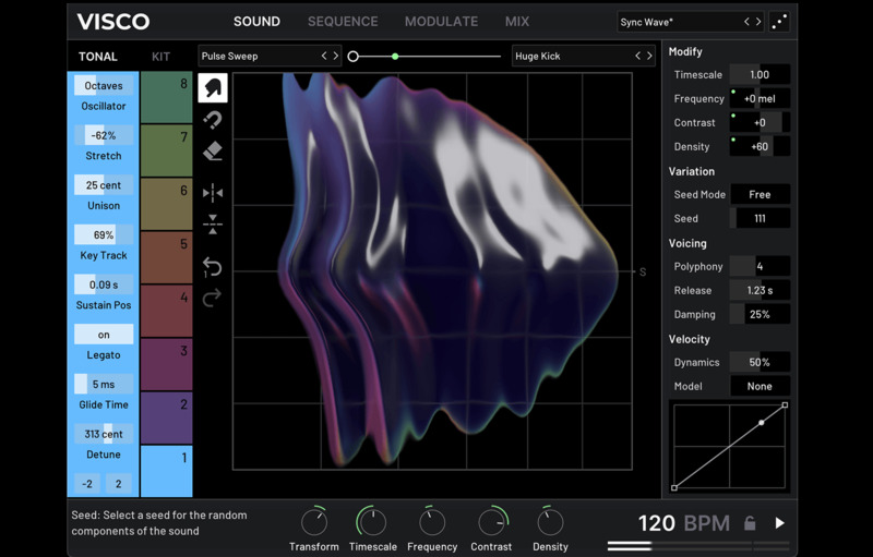 音の成分が色と形がつけられた粘土のように表示されていて、この粘土の形を変化させていくことで直感的に音作りができます!