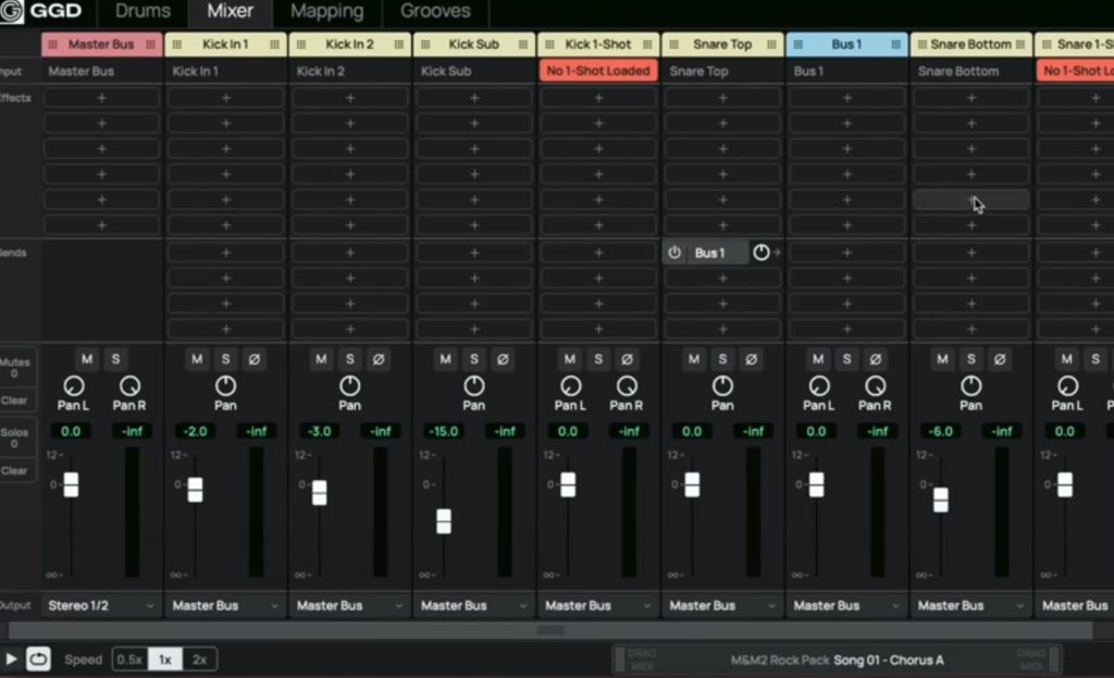 DAWスタイルのミキサー画面で構成されて、スーペリアドラマーやグルーブエージェントといった他のドラム音源のドラムマップに差し替えできます。
