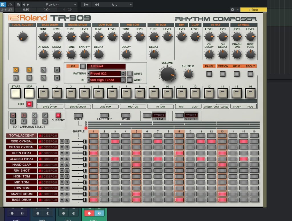 キックやスネアはアナログ回路で作られ、深みのあるサウンドを。ハイハットやクラップはデジタルサンプルを使用しているので結構リアルです。このハイブリッド感がTR-909の個性的なドラムキットの音に仕上がっています。