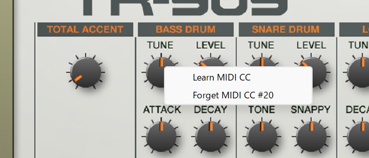 各ノブの上で右クリックを押すと、MIDI Learnの設定ができます。