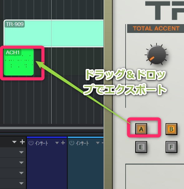 作ったフレーズは「A~H」のボタンの上からプロジェクトへドラッグ&ドロップすることでMIDIエクスポート、オーディオエクスポートが可能です。