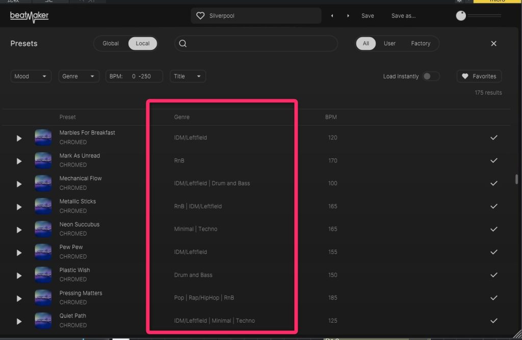 プリセットパターンがどんなジャンル・ムードに相性が良いか?をフレーズを鳴らす前に絞り込みできるようになっています。