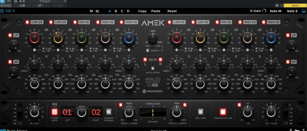 Brainworxプラグインらしく、画面下部Brainworxセット(TMT,THD,MONO Maker,Stereo Width)が付いています。