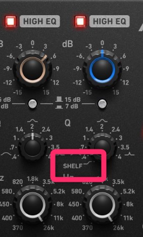 左端のLow EQと右端のHigh EQにだけシェルビングモードに切り替えが付いています。