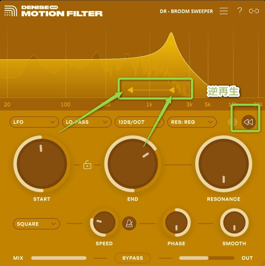 低い帯域から高い帯域へ一方通行でフィルターが動くのではなく逆向きで動かすことができます。