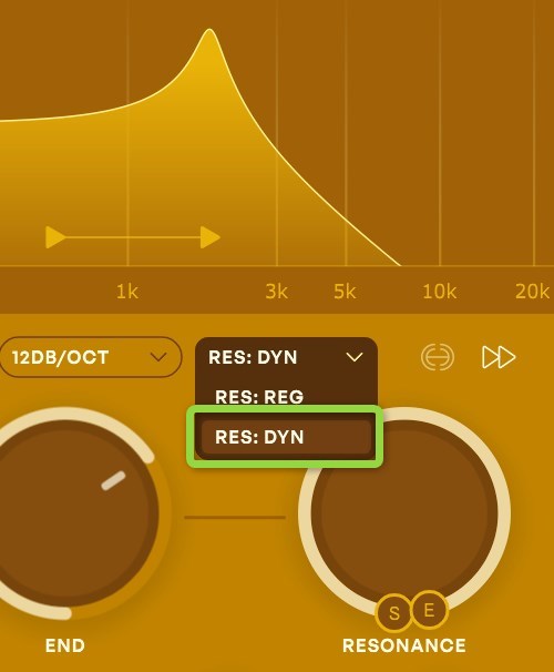 またレゾナンス設定を「RES:DYN」にするとレゾナンスの動く幅も調整できます。REGの場合は固定値です。