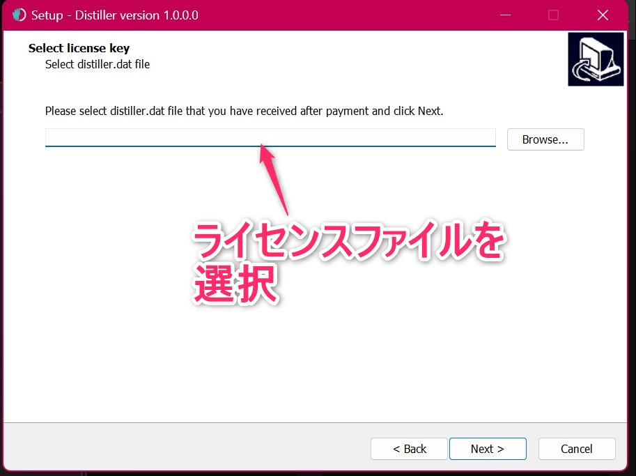 [3] インストーラーの途中で、「distiller.dat」を選択します。