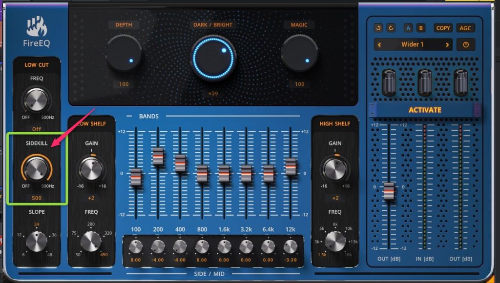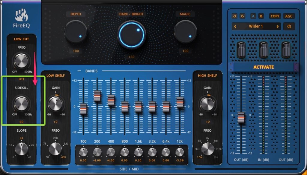 SideKillはステレオに広がりすぎたトラックに対して有効。広げるのではなくカットするための機能。