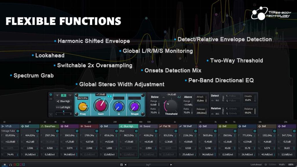 Three-Body Technologyによって開発され、近年のEQプラグインの中でも「解像度の高さ」「柔軟なカーブ設計」「アナログ的な音の温かみ」で圧倒的な評価を得ています。