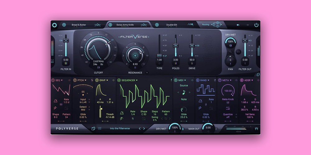 Filterverse は、8 つのモジュレーション ソース (メタ ノブ、シーケンサー/LFO、ADSR、エンベロープ フォロワー、ランダマイザー、ピッチ検出器、MIDI/CV 入力、オーディオ レート オシレーター) を割り当てるための非常に直感的なインターフェイスを備えています。
