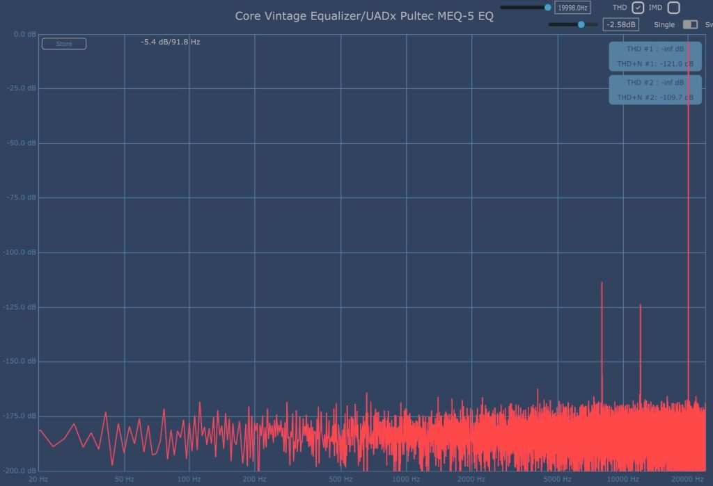 Core Vintageはパッシブかつパラレルなイコライザー設計を採用しているため、現代のソリッドステートイコライザーと比較して、バンド間の相互作用が異なります。この効果は、バンドが重なり合う場合に顕著に表れます。例えば、それぞれ6dBブーストされた2つのベルバンドでは、「標準的な」デジタルイコライザーのように合計12dBのゲインが得られません。