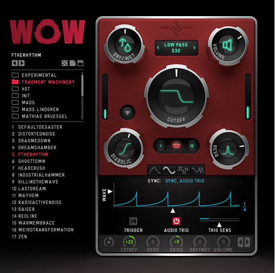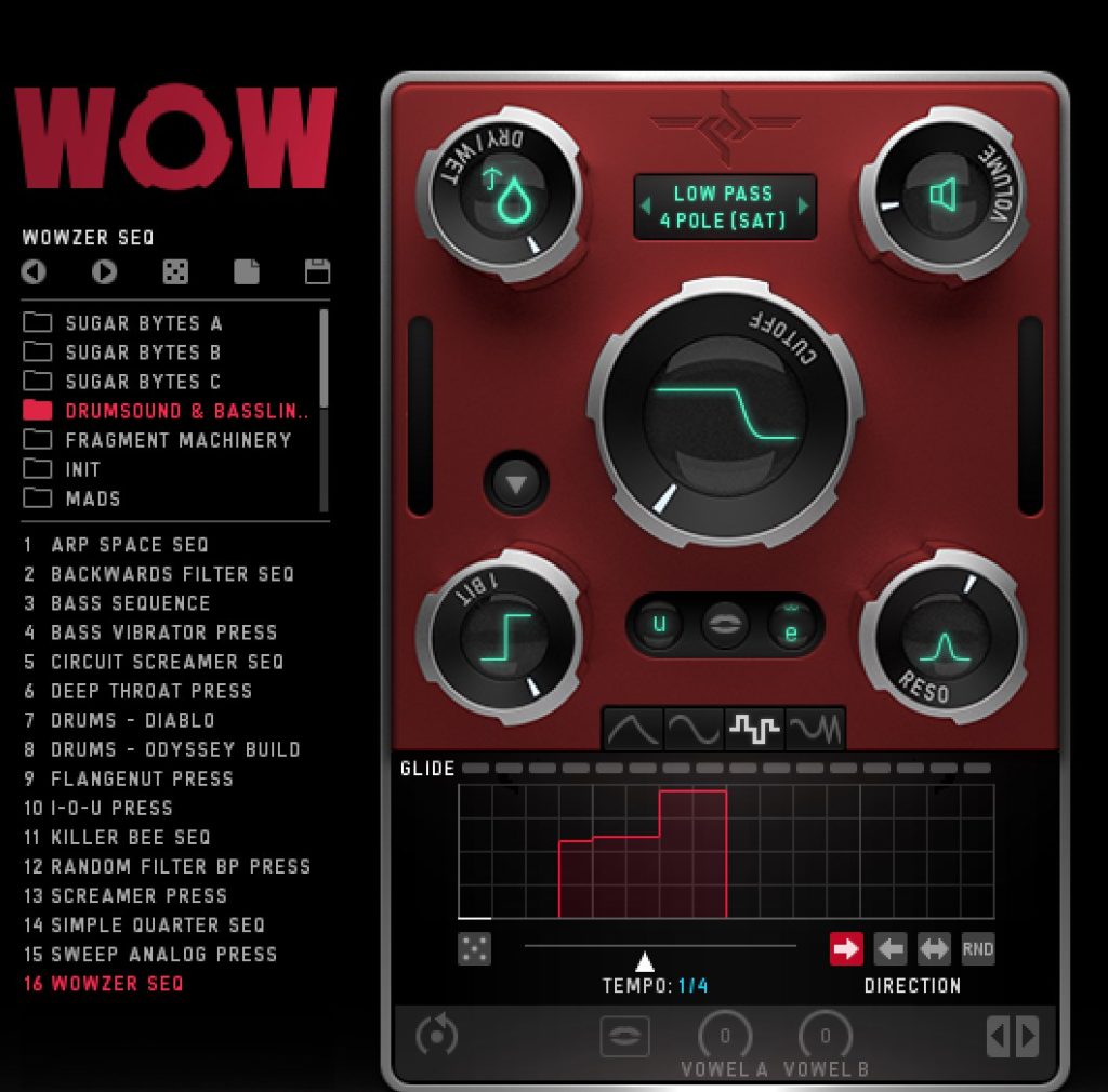 実際むずかしいフィルタープラグインの方が多いのですが、Sugar Bytes WOW2は操作が単純で簡単に面白い音が鳴らせるのが特徴です。