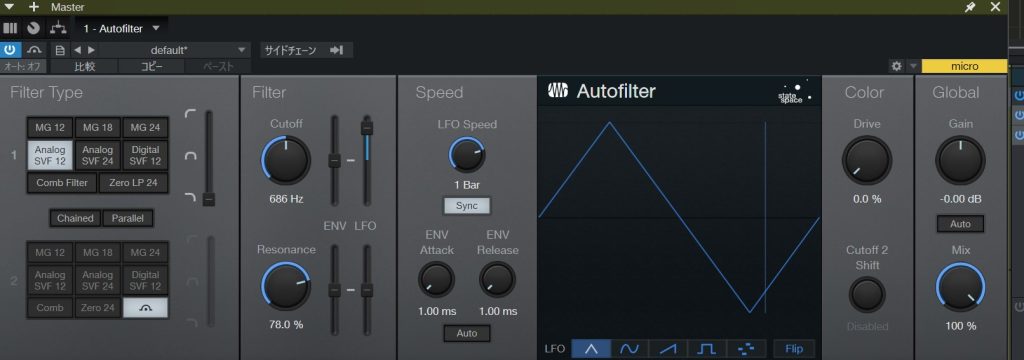 StudioOneの場合、標準で付いてくるAutoFilterがありますが、結構わかりにくさを感じます。コレに比べるとSugar Bytes WOW2は直感的に使えるのでストレス減。