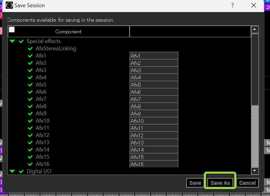設定セッションの確認が表示されます。SAVEを押すとファイルが上書きされるのでSAVE ASで別ファイル保存するのをおすすめします。