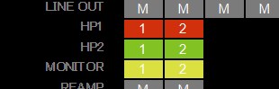 HP1(ヘッドホンアウト1),HP2(ヘッドホンアウト2),MONITORに設定されているので、