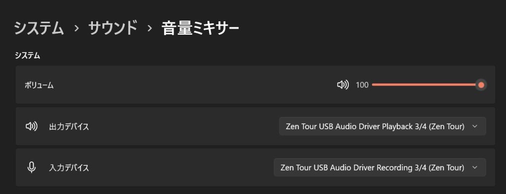 パソコン側の音量ミキサーの出力デバイスをZentourの3/4トラックにしています。