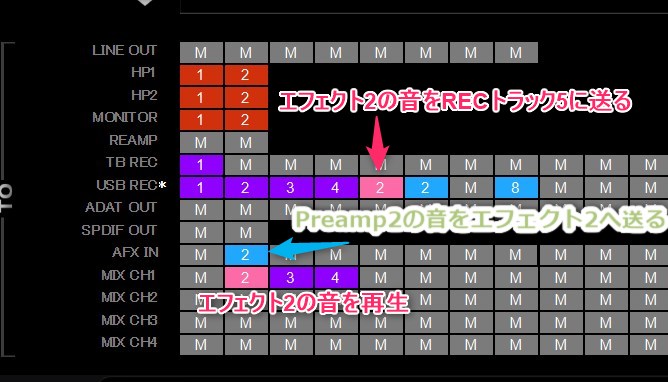 [3] DAWへ音を送る場合はAFX OUT 2をUSB RECのいずれかのブロックへ接続します。