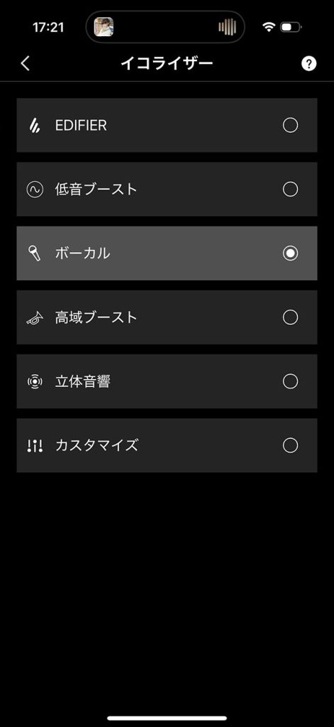 これまではEdifierの低価格モデルには、このイコライザーはついておらず、イコライザーモードを選ぶだけだったのでComfo Qのポテンシャルを引き出せる内容になっています。