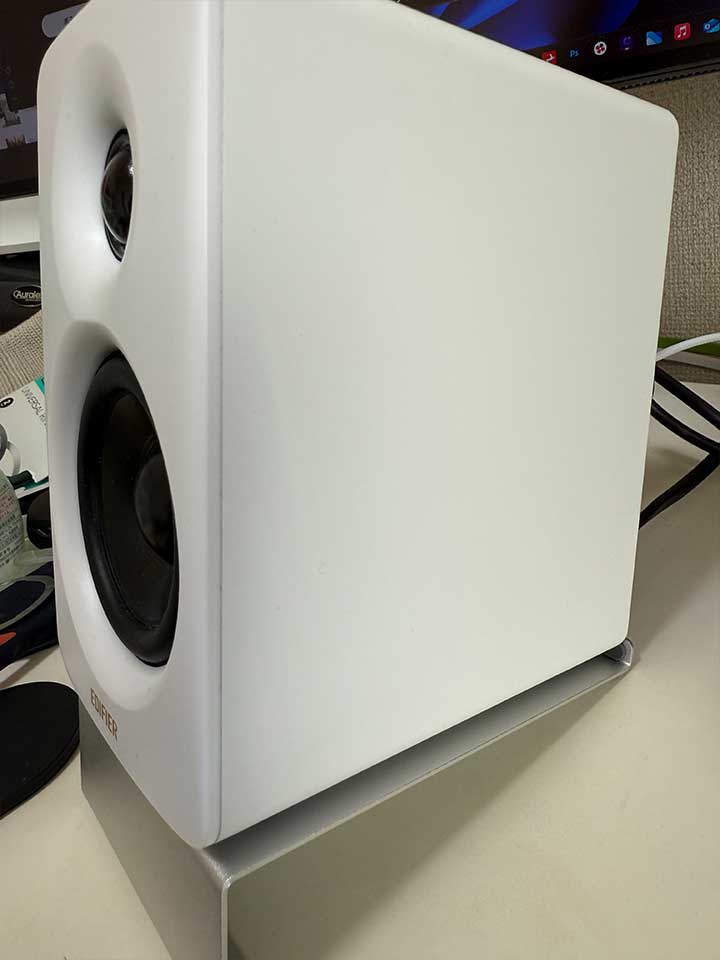 作業中のデスク上においてモニターにしたい場合は、付属のスピーカー台で角度を付けたほうが絶対良いです。