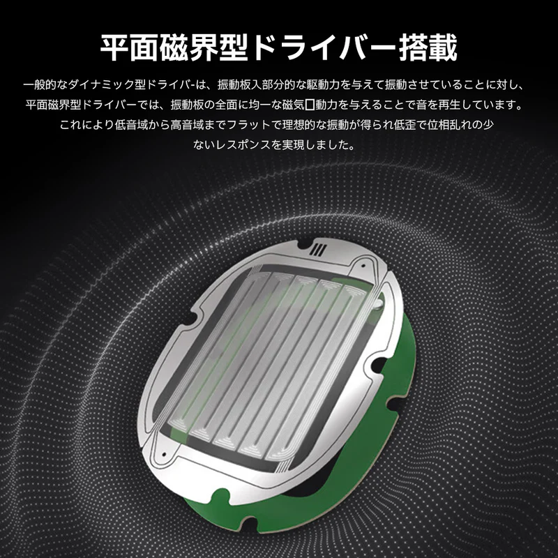 平面磁界型ワイヤレスヘッドホンで、一般的なダイナミック型ドライバ-と異なり、低音域から高音域までフラットで理想的な振動が得られ低歪で位相乱れの少ないレスポンスを実現。