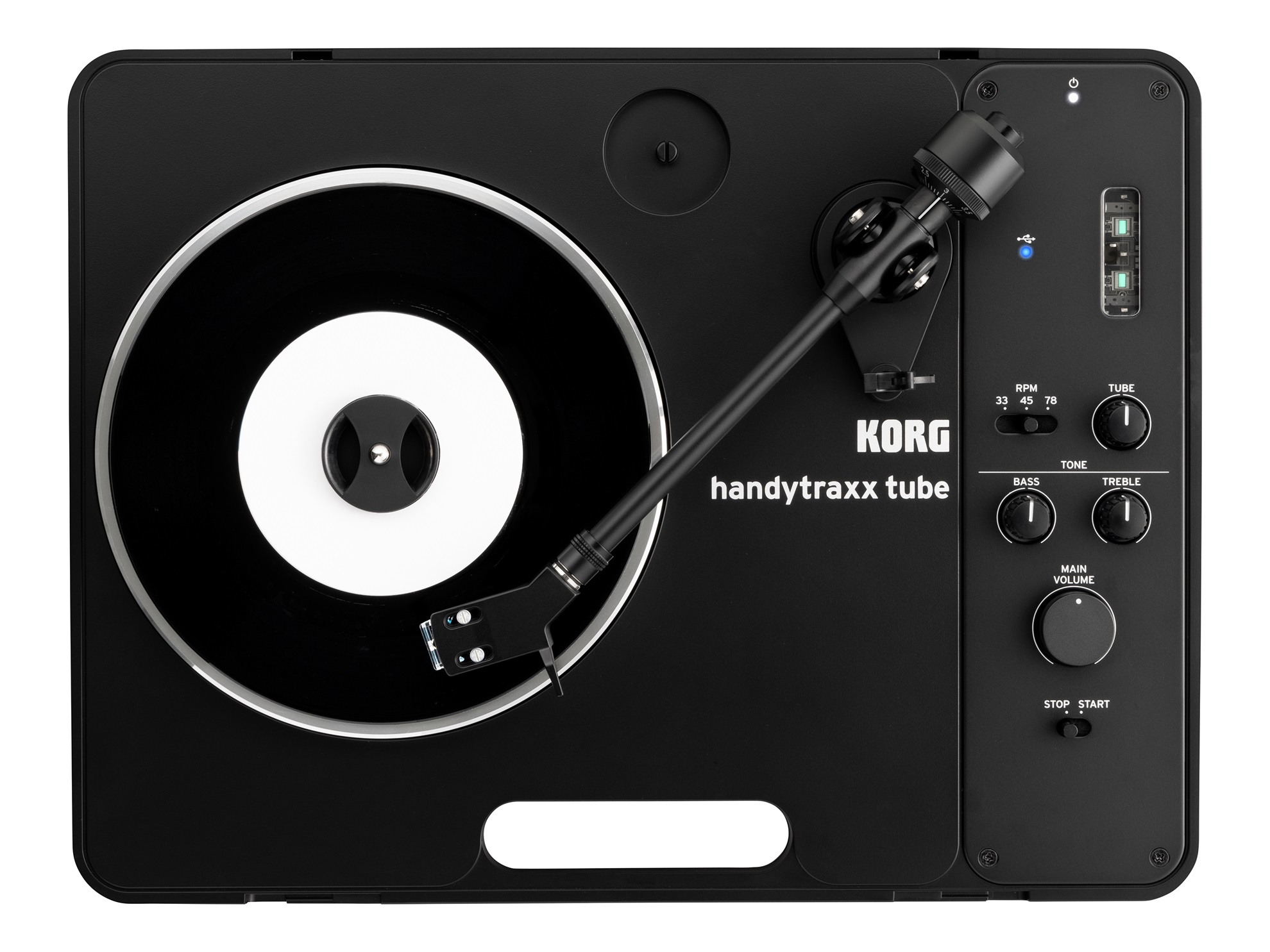 ステレオスピーカーを内蔵し、ポータブルなデザインで電池駆動も可能なhandytraxx tube は、どこにいても豊かで温かみのあるサウンドを楽しめます。正確で安定した回転を実現するアルミダイキャスト製プラッター*、MMカートリッジに対応したバランス型トーンアーム、コルグの革新的な次世代真空管Nutubeを搭載したフォノアンプなど、各パーツに音質を最優先にこだわり、細部までこだわって作り上げました。