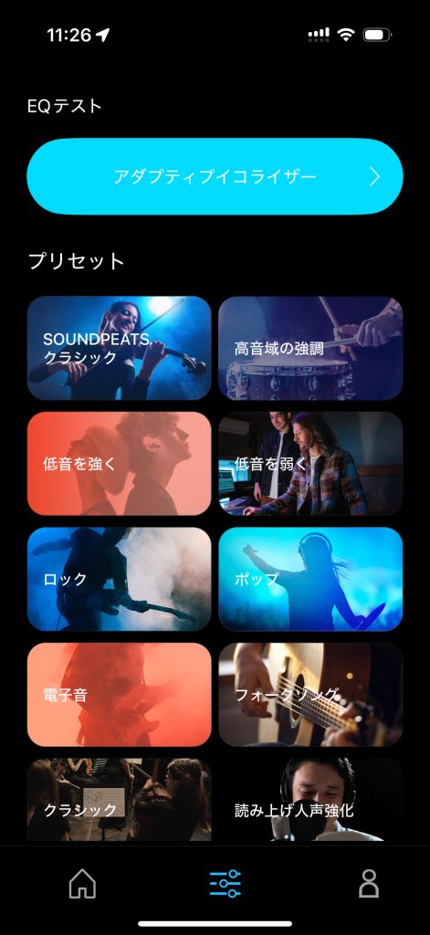 アダプティブイコライザーと、イコライザープリセットがアプリから設定できます。