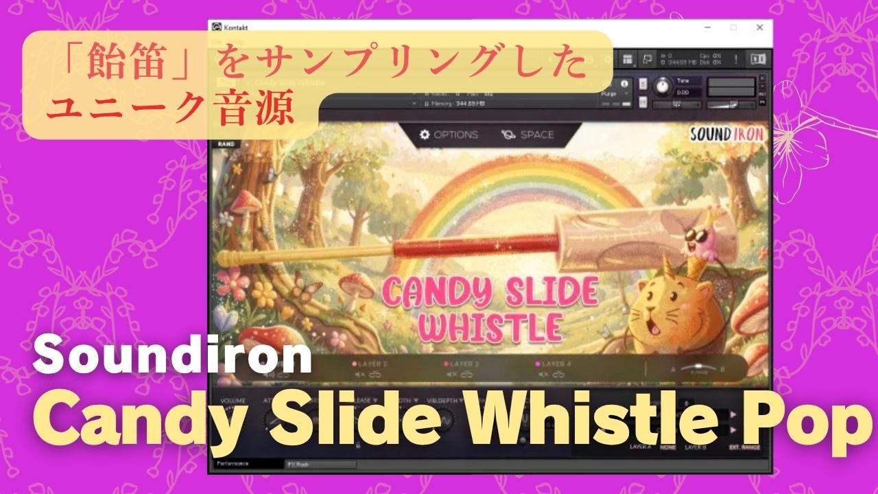 Soundironが手がけた「Candy Slide Whistle Pop(キャンディ・スライド・ホイッスル・ポップ)」。文字通り、実際に食べられるキャンディ・ホイッスル(笛型の飴)をディープ・サンプリングして作られた、本格的な仮想楽器です。