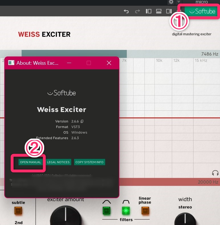 Softubeのロゴを押して表示される「Open Maual」のボタンを押します。