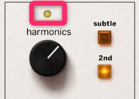 [1] LEDランプが点灯するまでharmonicsのノブをあげていきます。赤色が時折点滅するのが望ましいですが、常に赤色が点滅するのは望ましくありません。