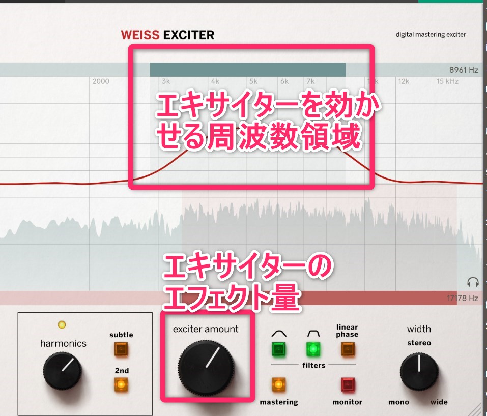 [2] 上の青緑のフィルター領域を調整して、エキサイターを効かせる周波数領域を指定します。