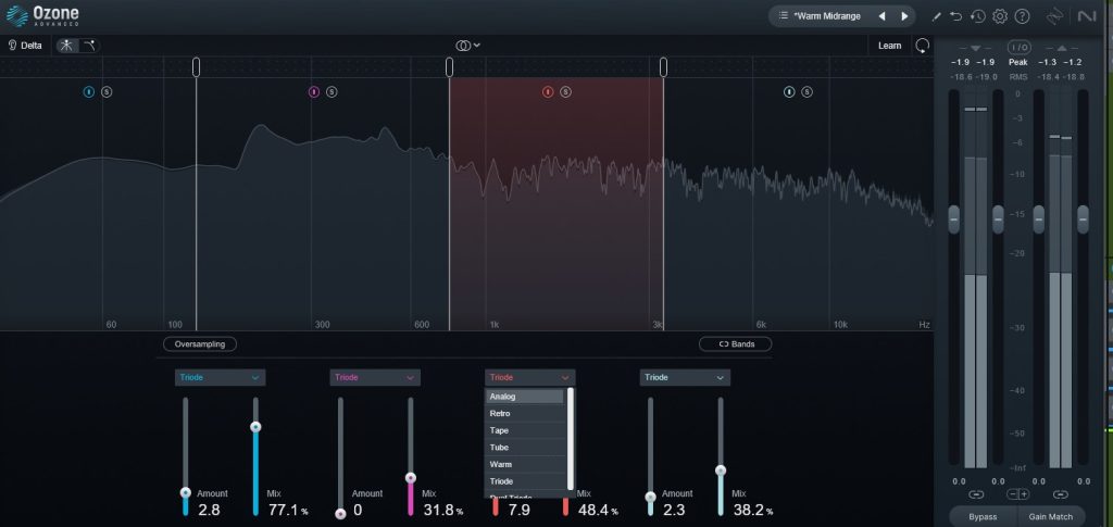 iZotopeのエキサイターはNeutron ・Ozoneともにマルチバンドで区切れて、帯域ごとにサチュレーションタイプを指定できるのが特徴です。指定できる範囲が広いためベースエキサイターとしても使えます。(Neutron/ OzoneのAdvancedエディションにしていると個別のエフェクターとして使えます