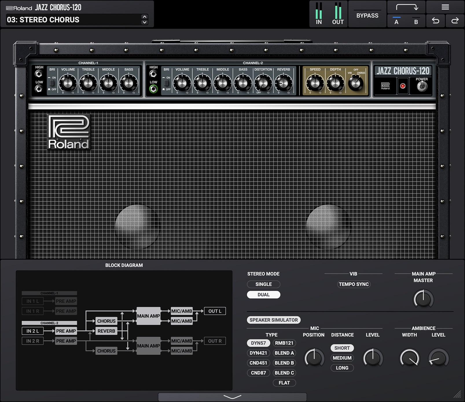 世界初のコーラスエフェクトを搭載。2基の12インチスピーカーとツインアンプにより、一方がダイレクトな音、もう一方がピッチを揺らした音を出力し、空間で合成することで立体感のあるサウンドを生み出す。
