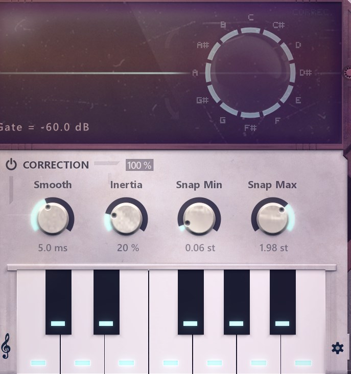 円形のグラフとキーボードの両方でピッチ補正(ピッチコレクト)するときに特定の音程にピッチコレクトするか?のON/OFFが決められます。