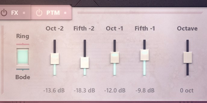 特にPTMセクションにある低音のハーモナイザーが強力で、あまり他のプラグインでは見られないハーモニーの組わせになります。(ハーモナイザーのピッチは固定