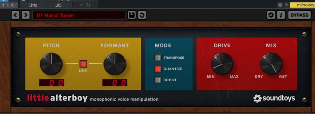 Hard Tune DriveはLittle AlterBoyについているDriveノブをグッとあげて歪ませた音を加えています。MIX値の割合でエッジの聞いたトーンにするかほんの少し歪ませた音にするか簡単に設定できます。
