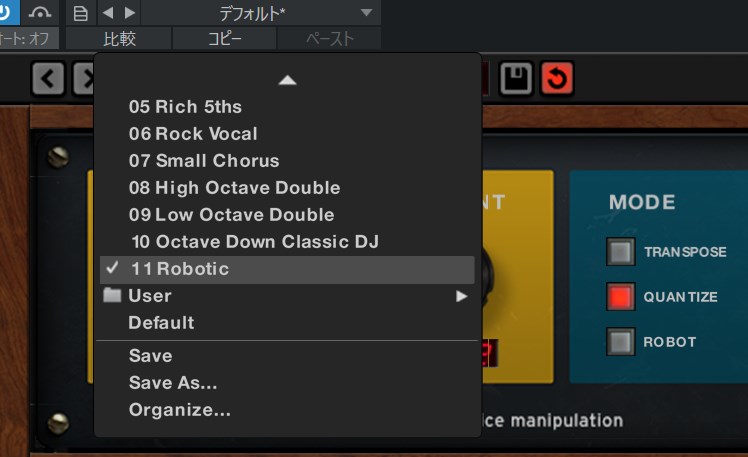 | Quantize | ケロケロボイス | ボーカルをできるだけ早く半音半音に近づけます。 クオンタイズを使用した結果は非常に聞き取りやすいもので、無数のポップ/ラップ/R&B ヒット曲に見られる自動チューニング効果に似ています |
