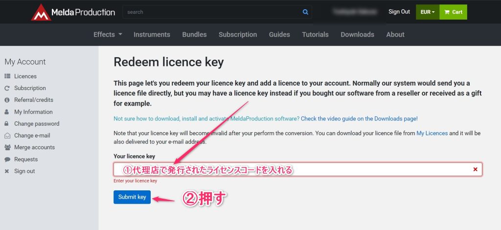 meldaproductionのログイン後にある「Redeem licence key」のページを開きます。