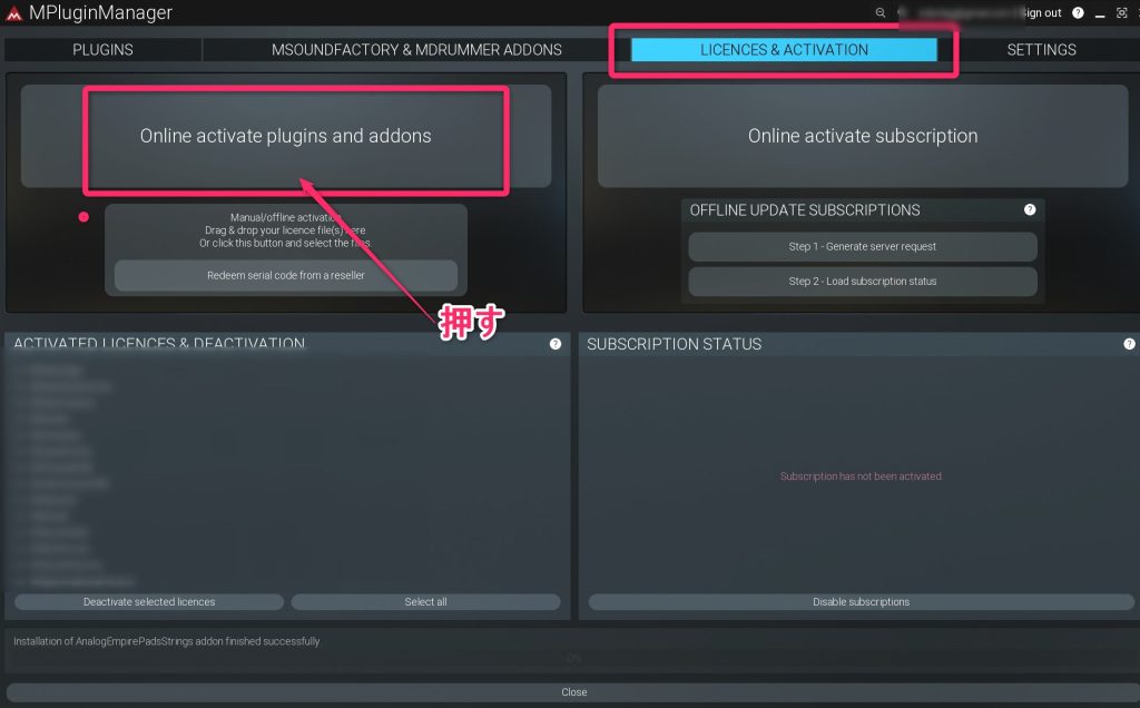 MPluginManager を開き「License & Activation 」のタブを表示。
