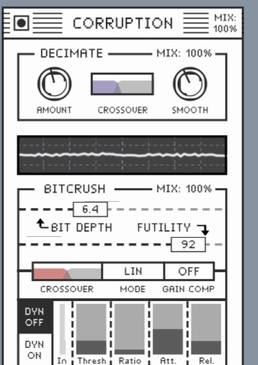 デシメーションによるサンプルレート低下、ビットクラッシュ、さらに“Bitrot(データ腐敗)”機能で、古いCDや壊れたデバイスを思わせる荒れたノイズ感や破損を演出。音を意図的に破壊することで、唯一無二のテクスチャを生み出します。