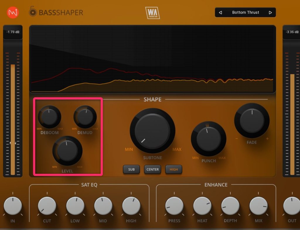 同じくW. A. Productionから出ている「kickshaper」と同じ開発チームによるプラグインで、低域を輝かせる処理を行うためのマルチエフェクターです。