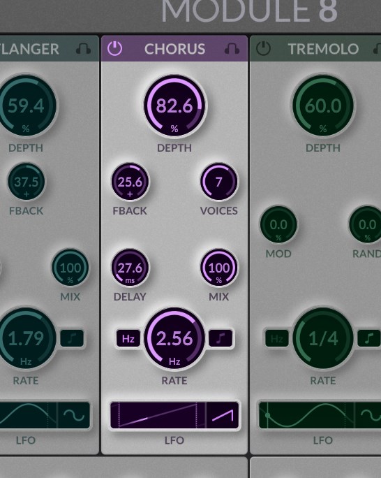 Chorus モジュールは、入力信号を複製し、複製のピッチを変調することでサウンドに厚みを与え、豊かにします