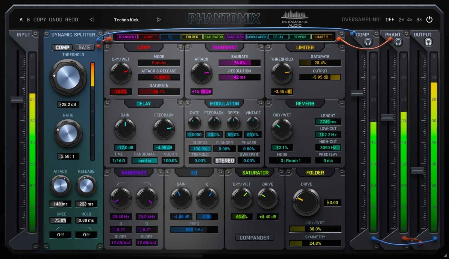 Phantomix独自のダイナミックスプリッターは、通常圧縮によって除去されてしまうダイナミックニュアンスを元の信号から分離し、これらの「除去された」要素を強力なエフェクトセクションに直接ルーティングします.