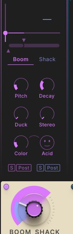 - Shack(シャック):こちらは逆に、高域成分(スネアやハイハット)にターゲットを絞り、金属的な「キン」というアタックや、ホワイトノイズなどのジャリッと鳴る質感をレイヤー(重ねる)します。808系の単調なドラムにレイヤーするだけで、アナログ感あふれるダーティな響きを瞬時に作り出せます。 さらに、このモジュールには「Post(ポスト)」ボタンが用意されており、他の全てのエフェクト(Compressなど)の影響をバイパスさせて一番最後に合成するような、高度なパラレル・プロセッシングまでボタン一つで実行できるのです。